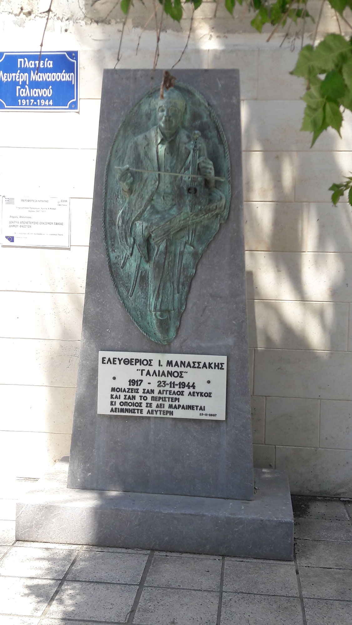 Η πλατεία της εκκλησίας πήρε το όνομα του αδικοχαμένου λυράρη Λευτέρη Μανασσάκη (1917-1944). Ο Λευτέρης ο Γαλιανός, καταγόμενος από μια φιλόμουση οικογένεια (ο πατέρας του, ο παπά-Γιάννης ήταν και λυράρης και όλα τα αδέρφια του Λευτέρη είτε έπαιζαν μουσική είτε τραγουδούσαν), αν και σκοτώθηκε σε ηλικία 25 ετών, θεωρείται από τους σπουδαιότερους δημιουργούς της εποχής του. Άφησε μουσική παρακαταθήκη το Γαλιανό συρτό. Στην πλατεία έχει τοποθετηθεί προτομή του.