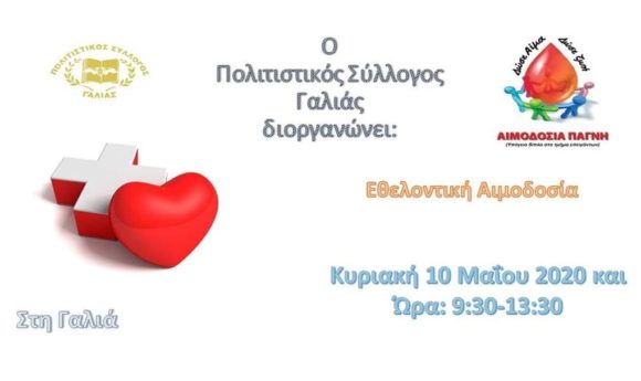 Με πρωτοβουλία του πολιτιστικού Συλλόγου Γαλιάς θα διεξαχθεί εθελοντική αιμοδοσία την Κυριακή 10 Μαΐου 2020 από τις 9.30 π.μ έως τις 13.30 μ.μ.