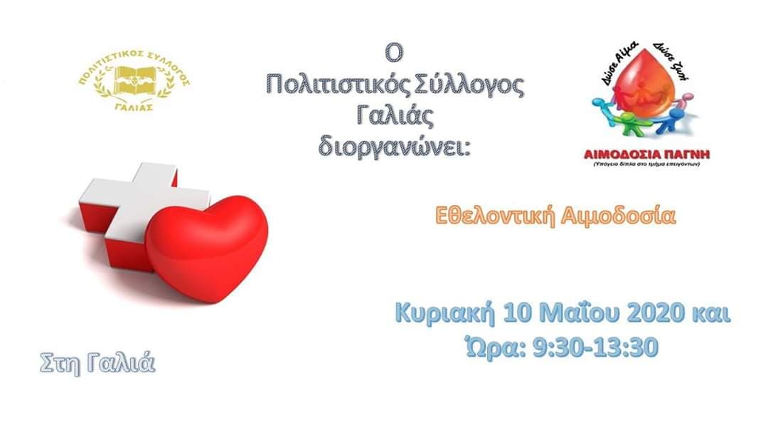 Με πρωτοβουλία του πολιτιστικού Συλλόγου Γαλιάς θα διεξαχθεί εθελοντική αιμοδοσία την Κυριακή 10 Μαΐου 2020 από τις 9.30 π.μ έως τις 13.30 μ.μ. Παρακαλούνται όλοι οι αιμοδότες να έχουν μαζί...